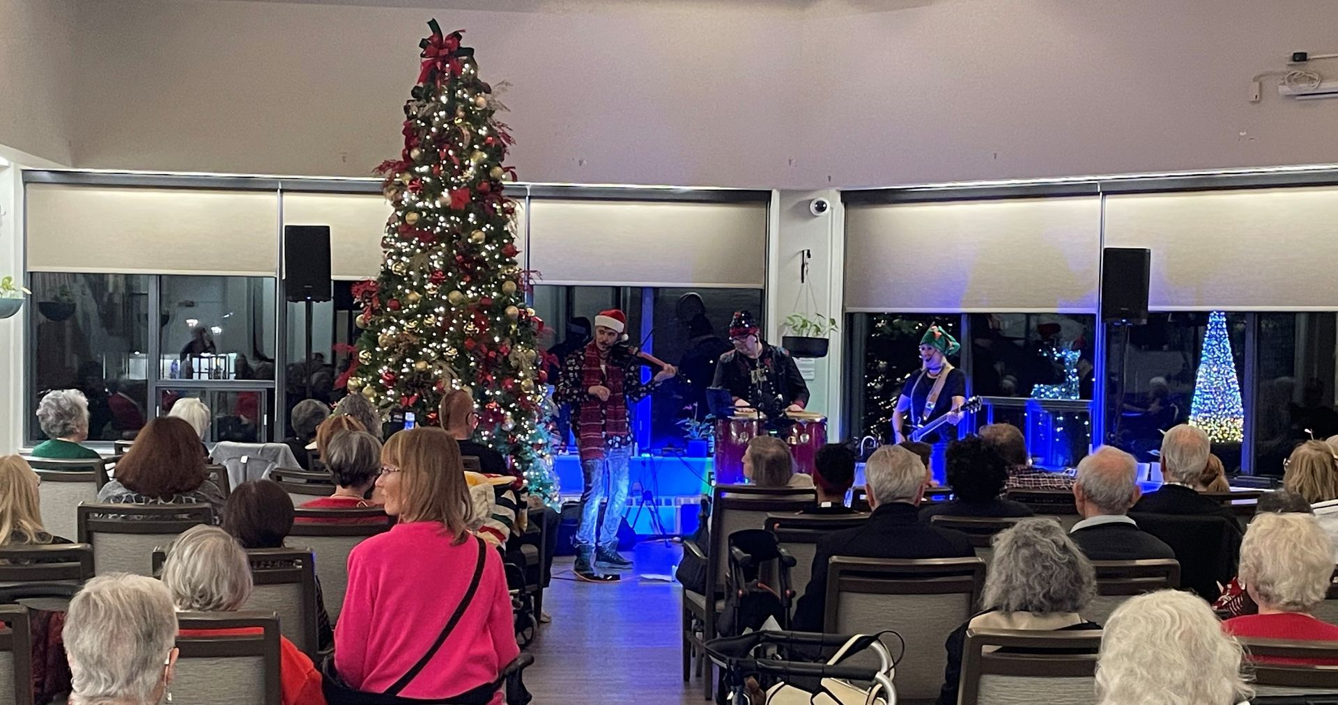 At 7pm, the Fiddlestix began to perform a variety of songs, much to the delight of the audience. The mood was joyous, and the feelings were festive, with the warm glow of the Christmas tree lights twinkling as the band played.